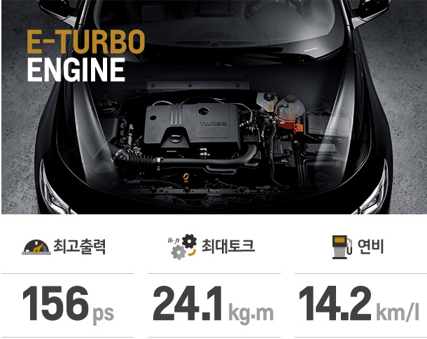 GM의 차세대 전략 터보 엔진으로 배출가스 감소와 연비 향상을 위해 중량이 감소된 엔진입니다. 최고출력 156ps 최대토크 24.1kg·m 연비 14.2의 스펙을 가진 엔진입니다.