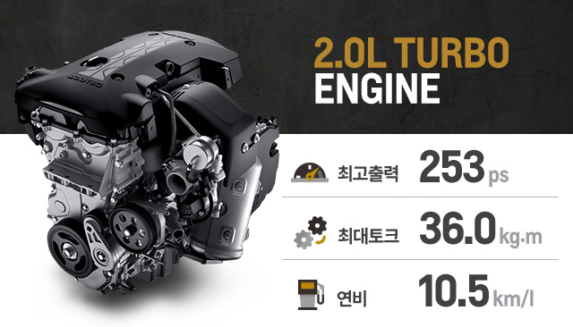 프리미엄 2.0 터보 엔진은 동급 최고의 성능을 가지고 있습니다. 이 엔진은 캐딜락 CTS, ATS 및 북미형 카마로에 탑재된 엔진입니다. 최고출력 253ps 최대토크 36kg·m 스펙을 자랑합니다.